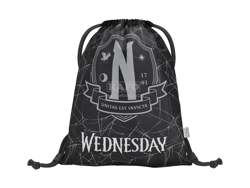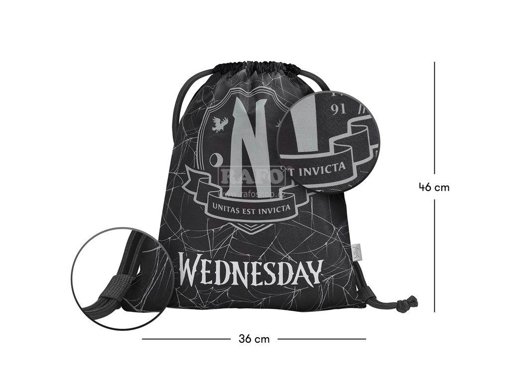 Praktický sáček na obuv či tělocvik s unikátním motivem populárního amerického seriálu Wednesday. • Sáček na obuv či jiné drobnosti pro vaše volnočasové aktivity. • Sáček je vyroben z pevného omyvatelného materiálu. • Zdrhování pomocí pevných tkanic, které zároveň umožňují nošení na zádech. • Velikost: 36 x 46 cmDoplňkové parametry