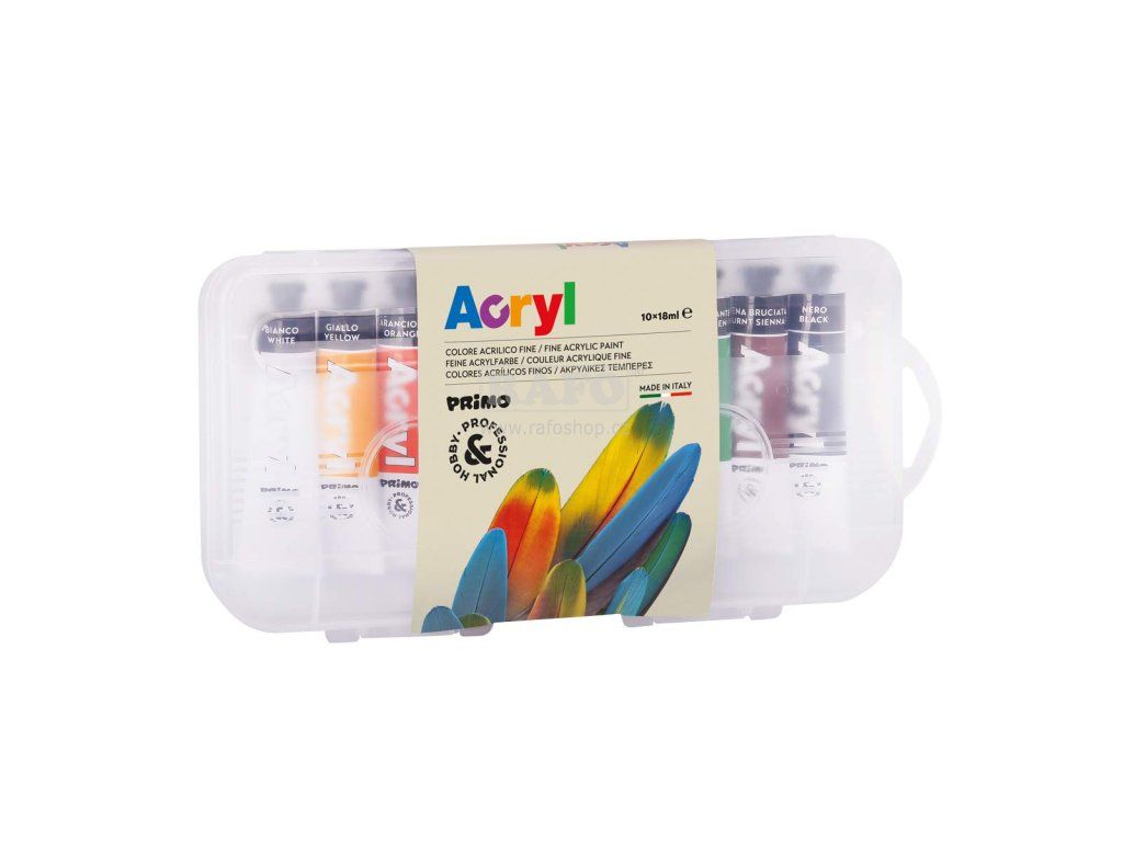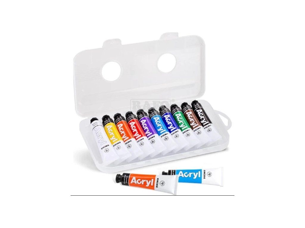 Akrylová barva PRIMO v tubičce obsahuje vysoké množství pigmentu. • tubička 10 x 18 ml • v praktickém plastovém pouzdře • velká krycí schopnost • vodou ředitelná • voděodolná • vhodné pro všechny savé podklady • Jasné a syté odstíny. Barvy po zaschnutí nejsou vypratelné, nutno odstranit ihned teplou vodou a mýdlem.Doplňkové parametry