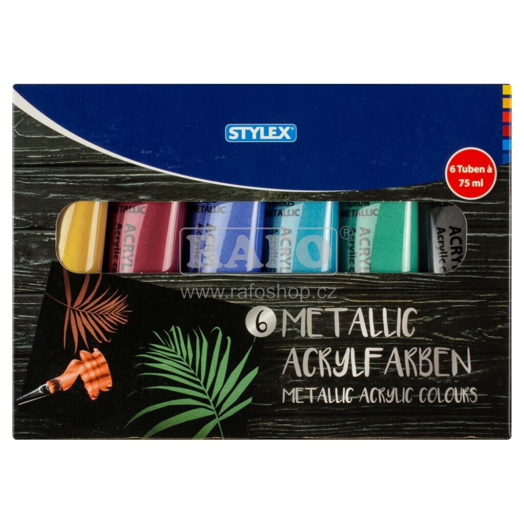 Akrylové barvy metalické - sada 6ti barev 75 ml - baleno v krabičce. Sada kvalitních akrylových barev v tubě. Jsou založeny na vodní bázi a k jejich ředění a vymývání štětců potřebujeme jen vodu. Lze je použít k malování na papír, plátno, dřevěné desky, lepenky potažené plátnem. Nepoužívat mastné, příliš hladké či lesklé povrchy. Jde o vodou ředitelné barvy, proto je vhodné pracovat s papírem s vyšší hodnotou gramů, aby se nasátím vodou nezkroutil. Používat zvláštní štětce určené pro malbu akrylovými barvami.