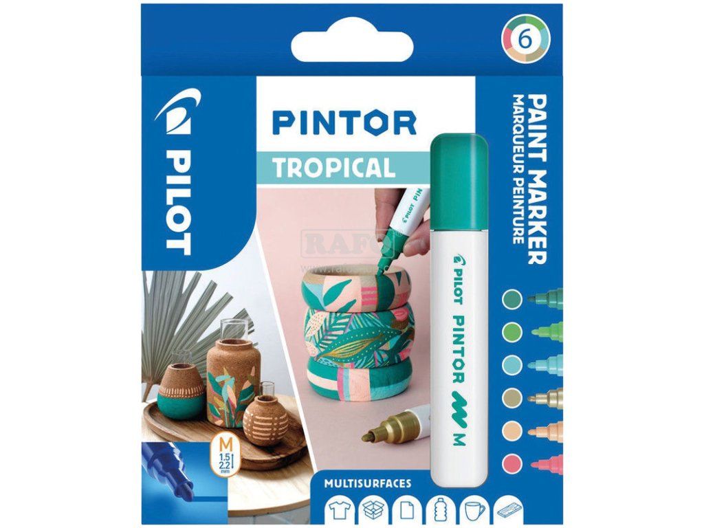 Paint Marker Pilot Pintor je ideální pro kreativní účely od amatérských umělců až po profesionály. Pigmentovaný inkoust na vodní bázi rychle schne a je neprůhledný. Popisovač lze navíc použít téměř na všechny povrchy jako je papír, karton, dřevo, kov, plast, sklo, keramika, porcelán a textil. Na hladkém povrchu jej lze snadno otřít. Trvalé výtvory na látce, dřevě, skle, plastu, keramice atd. by měly být fixovány fixačním sprejem. Na začátku použití je třeba Paint Marker silně protřepat, aby se získala rovnoměrná směs inkoustu. Hrot je pak třeba několikrát lehce promáčknout na testovací povrch, aby inkoust natekal na hrot. • Tropical barvy • Hrot: M • Šířka stopy: 1,5 - 2,2 mmDoplňkové parametry