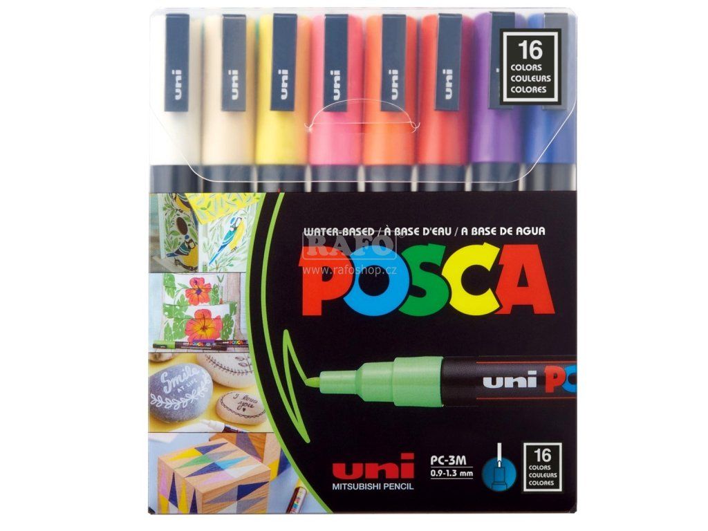 Sada popisovačů POSCA s tenkým hrotem, navržené pro profesionály a nadšené výtvarníky s požadavkem na psaní ultra-tenkou a konzistentní linkou v širokém výběru barev. Bezkonkurenční inkoust s vysokou krycí schopností je určen i na tmavé povrchy. Kvalita a sytost barev ohromí jak umělce tak i fandy, kteří budou nadšeni “magickým” efektem POSCA. Nabízí neomezené kreativní možnosti. Barvy jsou vrstvitelné, mísitelné, vodou ředitelné. Sada 16 barev, linka: 0,9 - 1,3 mm, sytá barva, vynikající hustota, vnitřní i venkovní použití. Po zaschnutí voděodolnéDoplňkové parametry