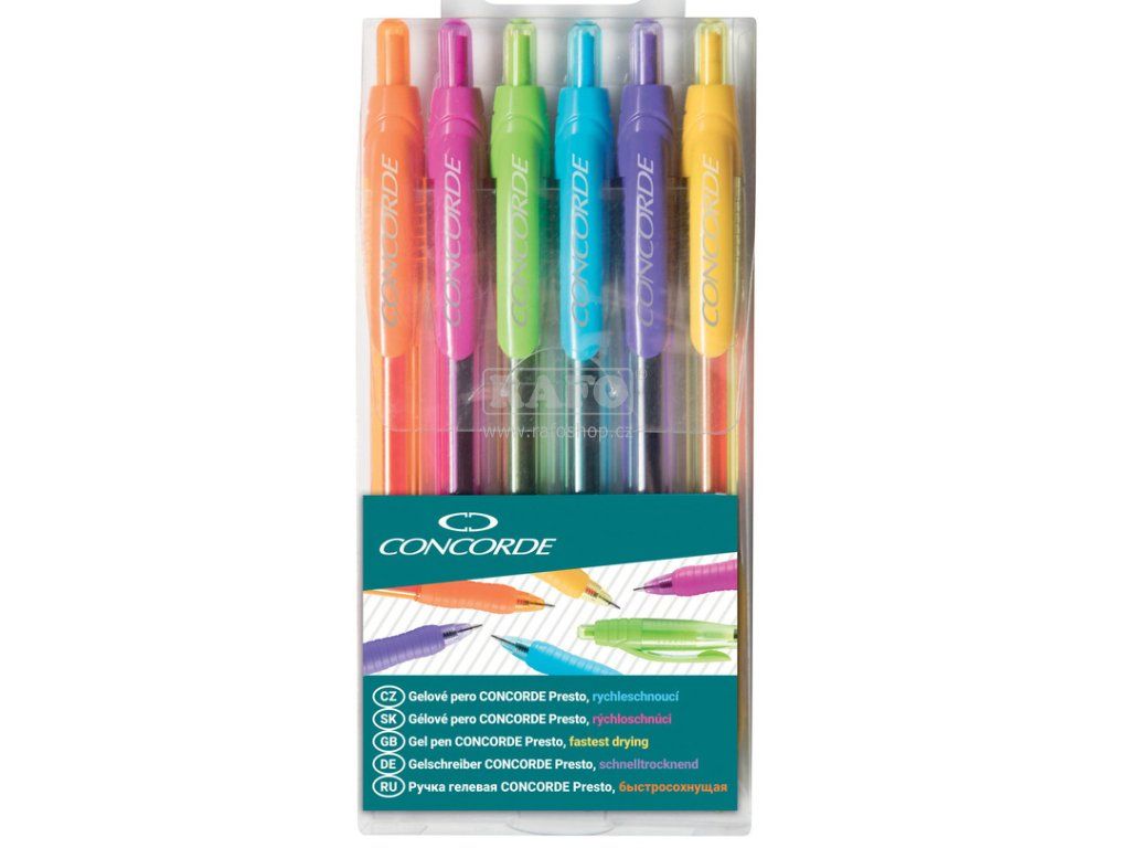 • Sada pestrých gelových kuličkových per • RYCHLESHNOUCÍ • Výrazná, sytá stopa 0,35mm • Stiskací mechanismus, gumový úchop • Dodáváno v pevném plastovém pouzdru • Jednorázová náplňDoplňkové parametry