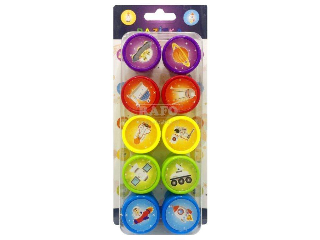 Razítková sada 10 ks Vesmír. Dětská samonamáčecí razítka z plastu. Sada obsahuje celkem 10 ks razítek. Průměr razítka: cca 2,5 cm.Doplňkové parametry