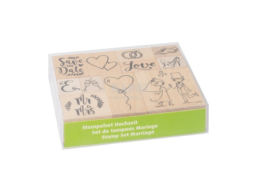 11 ks dřevěných razítek se svatebními motivy. Rozměr sady: 12 x 10 x 3 cm. Made in GermanyDoplňkové parametry