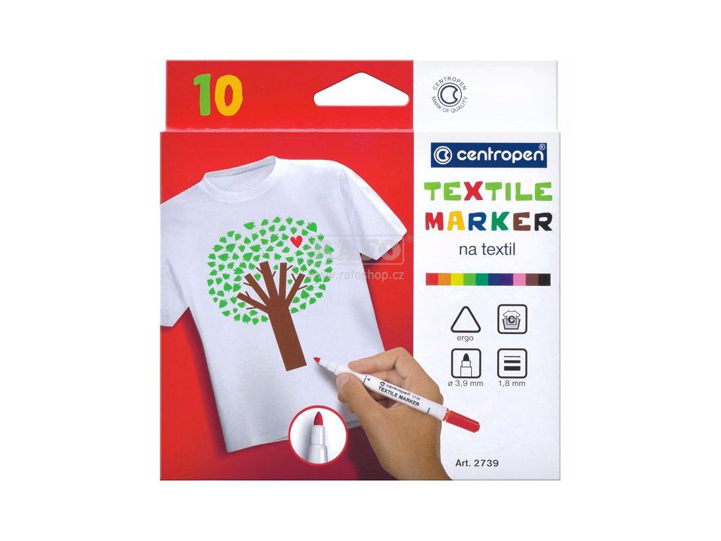 Značkovač na textil 10 ks 2739/10 . Prát do 60 stupňů. ERGO držení, zdravotně nezávadný inkoust, světlostálý, nevypratelný. Skladovat ve vodorovné poloze. Ventilační chránítko, válcový hrot, šířka stopy 1,8 mm. Barvy: červená, oranžová, žlutá, sv. zelená, tm. zelená, modrá, fialová, růžová, hnědá, černá.Doplňkové parametry