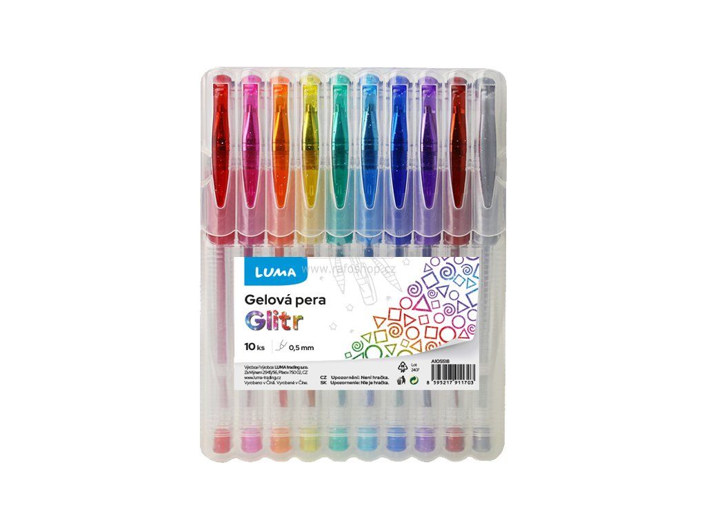 Sada plastových gelových per - glitterové barvy, gumová úchopová část pro příjemnější psaní,, síla hrotu 1,0 mm. Jednorázové, nelze dokoupit náplně.Doplňkové parametry