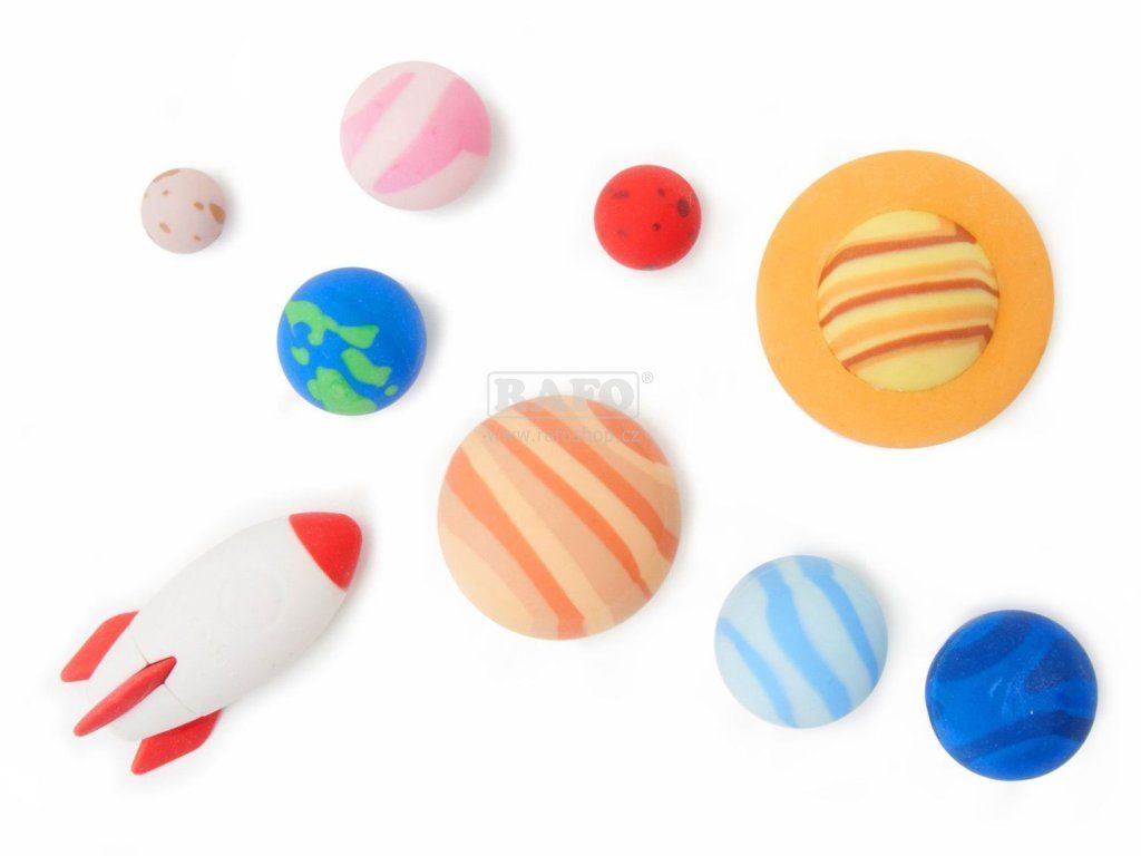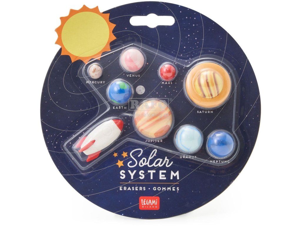 Sada gum Legami Solar System - Set Of 9 Erasers. Sada devíti gum pro nadšené astronauty obsahuje osm planet sluneční soustavy a vesmírnou raketu.Doplňkové parametry
