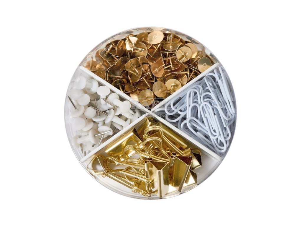 Potřeby do kanceláře, obsahuje: 10 ks zlatých klipů, 70 bílých sponek, 30 bílých napínáčků do nástěnky, 200 zlatých plochých napínáčků.Doplňkové parametry