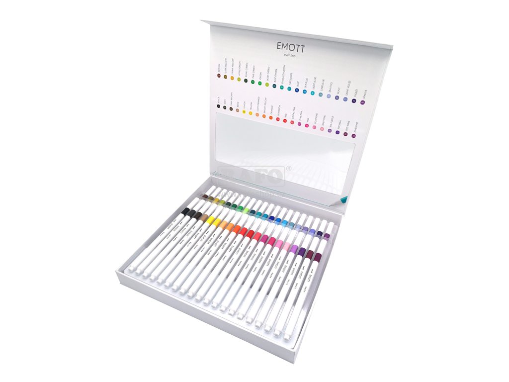 Moderní design, rafinované a minimalistické tělo, bílý hrot. To je Emott. Liner pro každodenní psaní, skicování i kreslení. S více než 40 barvami od sladkých tónů po jemné pastely, přes zářivé základní barvy až k odvážným zemitým tónům, lehce uniknete do svého kreativního barevného světa. Emott – vyjádřete své emoce stylově. • šířka stopy: 0,4 mm • tenké tělo s víčkem • čtvercový tvar pro lepší úchop • vhodný na psaní i kreslení • odolný hrot • kompletní sada 40 odstínů • včetně dárkové krabičky s magnetickým uzávěremDoplňkové parametry