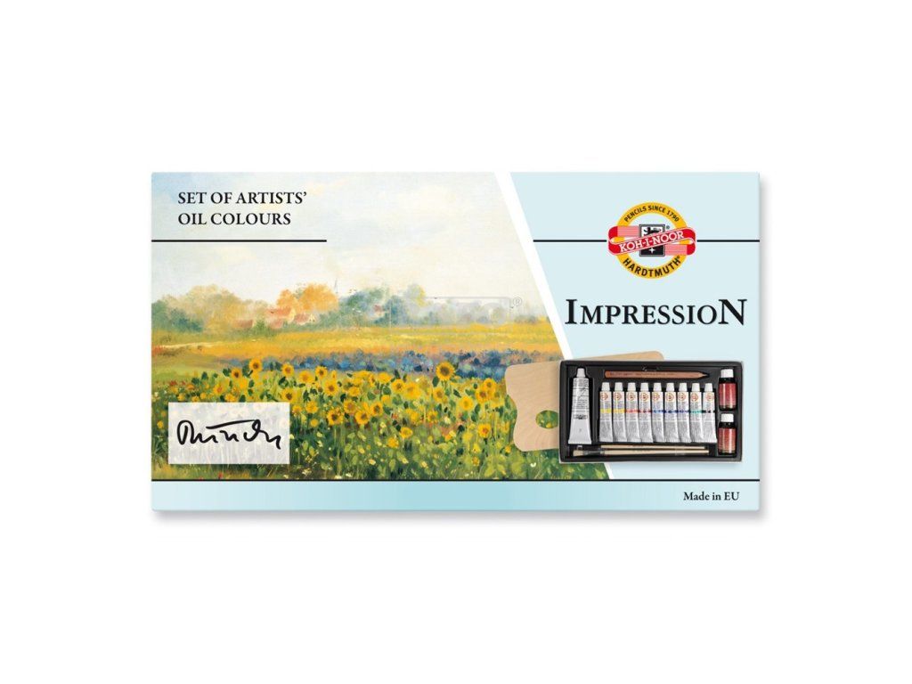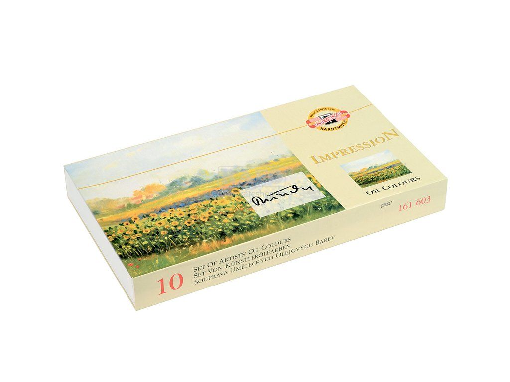Kazeta olejovych barev Impression. Obsah:10 barev po16ml, štětec, dřevěná paleta, ředidlo. Barvy obsahují některé další materiály, např. vosky, sikativ apod., zlepšující jejich funkční vlastnosti a stabilitu. Pigmenty s požadovanou světlostálostí, kryvostí, čistotou a odolností vůči prostředí dodávají přední evropští výrobci. Pojícím komponentem barev je lněný a saflorový olej. Olej lněný zasychá rychleji a vytváří tvrdší film než olej saflorový, více však žloutne. Proto se oleje saflorového používá k výrobě a ředění bělob a světlých odstínů. Olejové barvy jsou už od nepaměti velmi oblíbené. Barvivo je v nich smíšeno s olejem (nejvíce se používá lněný či ořechový) a ředí se terpentýnem. Charakter oleje obsaženého v barvách ovlivňuje krycí schopnost barev. Protože olejové barvy schnou delší dobu, můžeme s nimi pracovat ještě po nanesení na plátno (dřevo, lepenku....). Po zaschnutí barvy tmavnou. Malbu pak můžeme přemalovat, aniž bychom porušili spodní vrstvy obrazu. Olejové barvy mají hustou, krémovou konzistenci, kterou můžeme regulovat různými přísadami a namíchat si tak i transparentní barvu. Sada obsahuje 2 štětce. TIP NA DÁREK!Doplňkové parametry