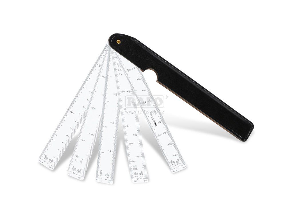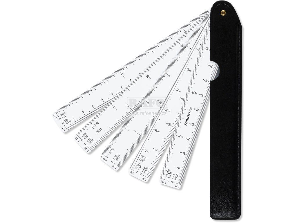 • Sada poměrových pravítek • praktický kapesní pomocník • 5 různých pravítek s různými stupnicemi (:10 :15 :20 :25 :30 :33 1/3 :40 :50 :75 :125) • v exkluzivním pevném koženém pouzdřeDoplňkové parametry