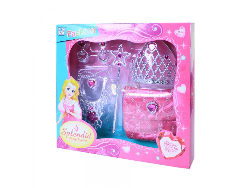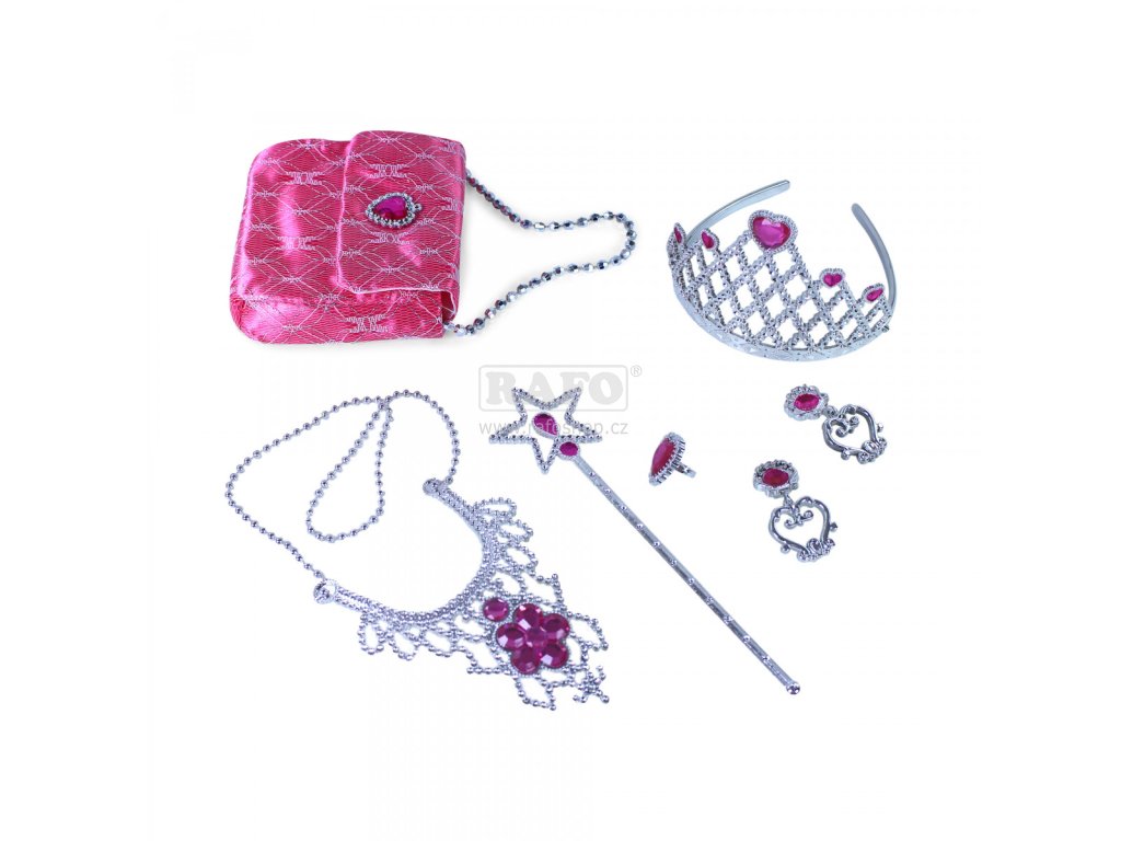 Exkluzivní sada pro všechny malé princezny. Sada obsahuje: zdobená korunka, náušnice, náhrdelník, hůlka a kabelka. Doplňky jsou zdobeny růžovými kamínky. Perfektní sada ke kostýmu princezny. TIP NA DÁREK.Doplňkové parametry