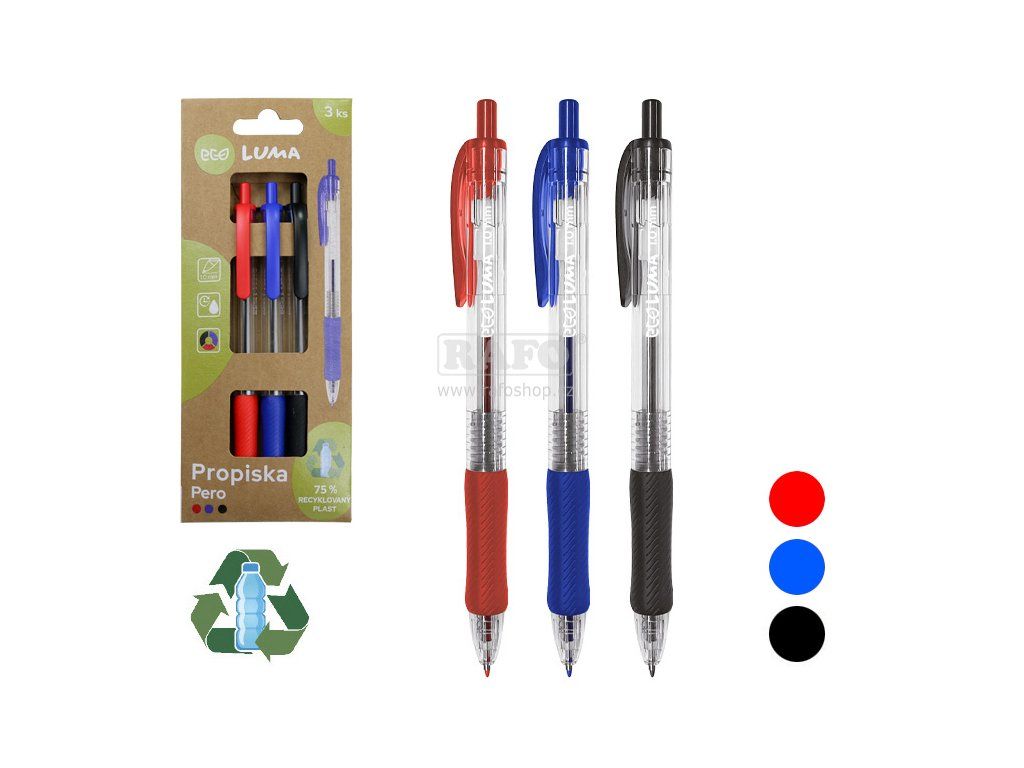 • sada 3 ks jednorázových propisek • plastové tělo vyrobeno ze 75% recyklovaného plastu • kuličkový hrot • šíře stopy: 1mm • barva náplně: modrá, černá, červená • hladké psaní • inkoust s nízkou viskozitou • stiskací mechanismus • měkký pogumovaný úchopDoplňkové parametry