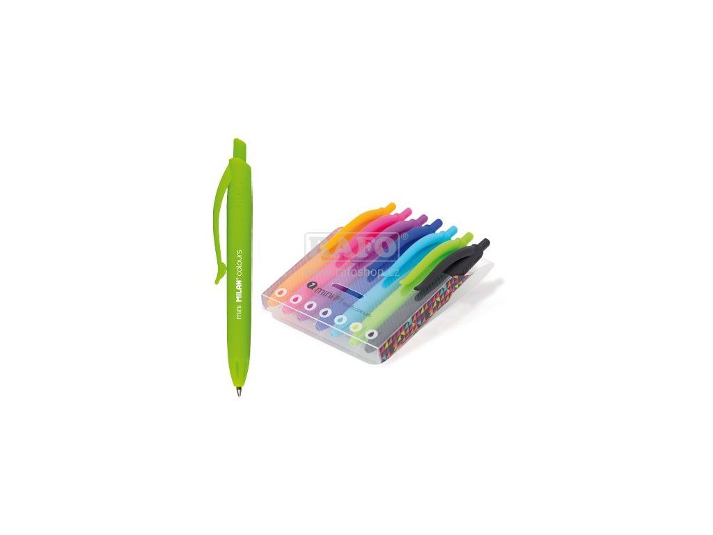 Plastové pouzdro obsahuje 7 mini P1 propisek, jejichž tělo je stejné barvy jako inkoust: oranžová, růžová, fialová, modrá, světle modrá, světle zelená a černá. Přibližná délka zápisu je 600 metrů, 1 mm hrot. Originální design vytvořený oddělením výzkumu a vývoje MILAN. Velikost pera: 10,2 x 1,7 cmDoplňkové parametry