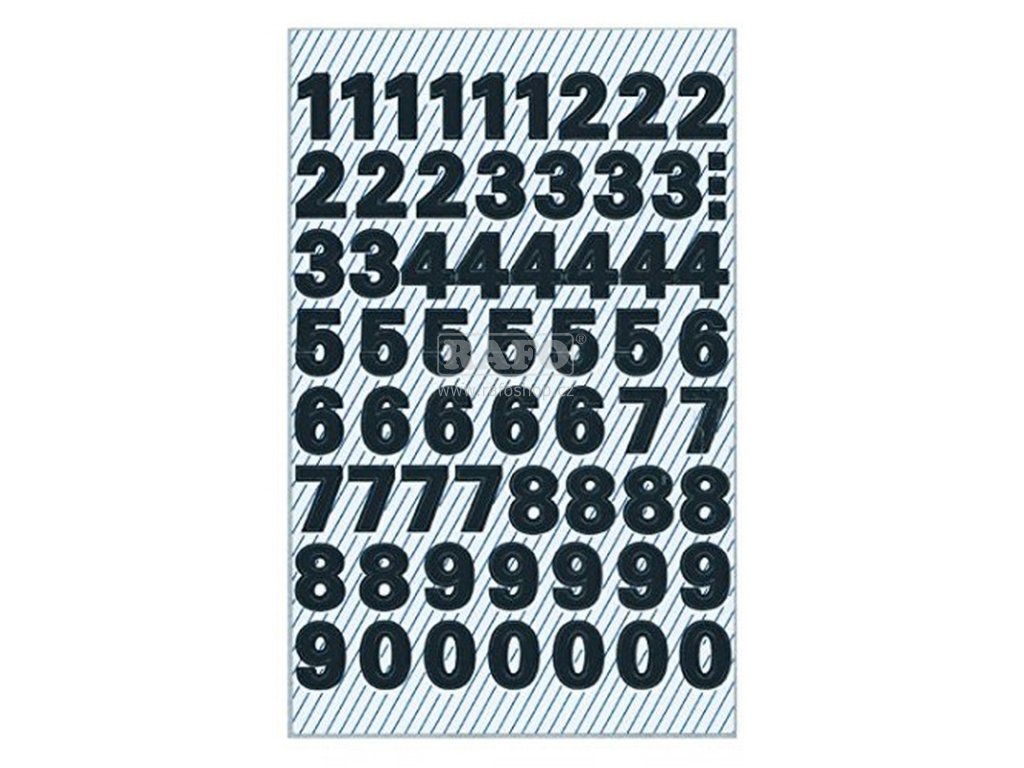 Výška 9,5 mm, barva černá, počasí odolná fólie, balení obsahuje 2 aršíky číslic od 0 do 9 . Voděodolné.Doplňkové parametry