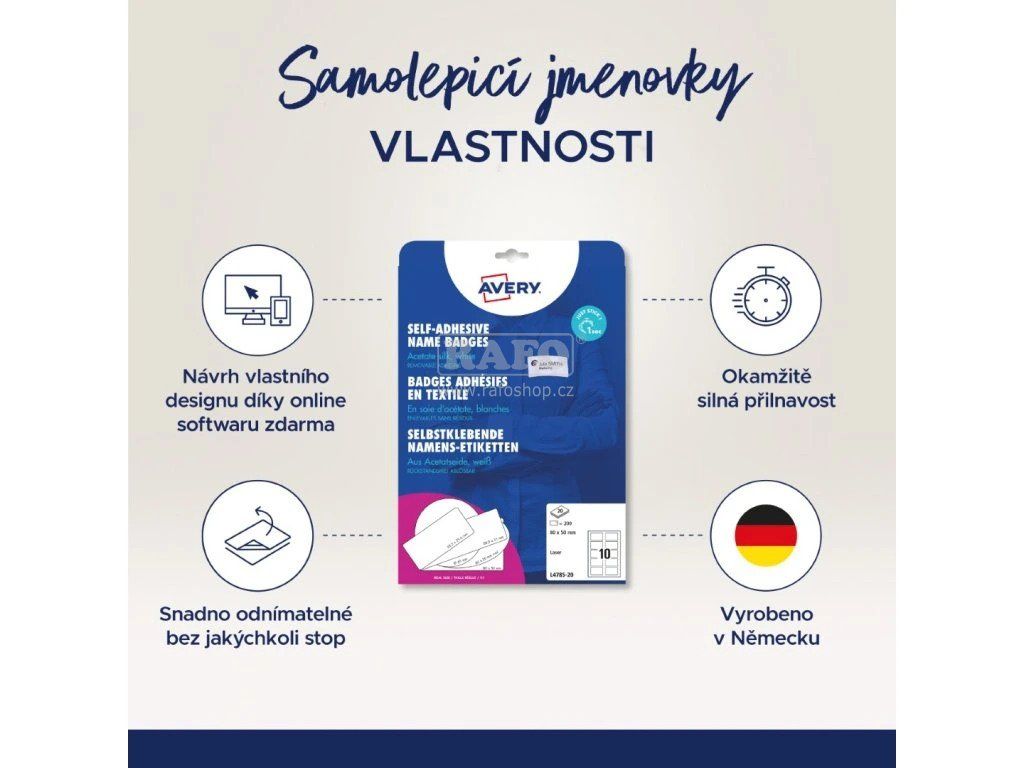Potisknutelné samolepící jmenovky na oblečení Avery Zweckform, rozměr 80x50 mm, 20 archů A4, 200 ks jmenovek v balení (10 ks/arch), umělé hedvábí, snímatelné lepidlo, barva bílá. Ideální na semináře, konference, kongresy, řízení návštěv atp. Etikety jsou vyrobeny z flexibilního umělého hedvábí a jsou použitelné na textilie všech typů. Bezpečná přilnavost a odnímatelnost bez zanechání stop lepidla a poškození oděvu. Jmenovku lze vyjmout z archu i s částí podkladového papíru, na který ji můžete po ukončení akce opět nalepit a uschovat pro pozdější použití. Při tisku se můžete spolehnout na bezproblémový průjezd archů tiskárnou bez uvíznutí a ostrý tiskový výstup, který se díky vynikajícímu přilnutí tonerového prášku nerozmazává. Pro všechny běžné černobílé i barevné laserové tiskárny.Doplňkové parametry