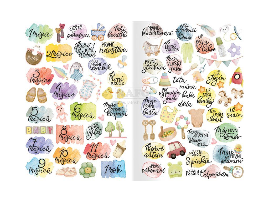 Exkluzivní samolepkový sešit s názvem Naše děťátko dodá fotkám Vašeho miminka roztomilý nádech. S našimi krásnými designy můžete ozdobit každou stránku alba a zachytit tak nezapomenutelné okamžiky pomoci krásných samolepek. Každá samolepka je pečlivě navržená a vyrobená s láskou, aby podtrhla jedinečnost každé fotografie. Dejte albu tu správnou finální podobu!Doplňkové parametry