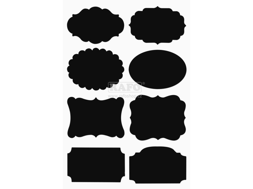 Samolepky různého tvaru pro dozdobení papírových nebo skleněných dekorací, na popis různých předmětů. Černá tabulová vrstva vhodná pro popis křídou nebo křídovým popisovačem. Výška samolepky: od 3,8 cm do 5 cm. Šířka samolepky: 6,3 cm. Balení 16 ksDoplňkové parametry