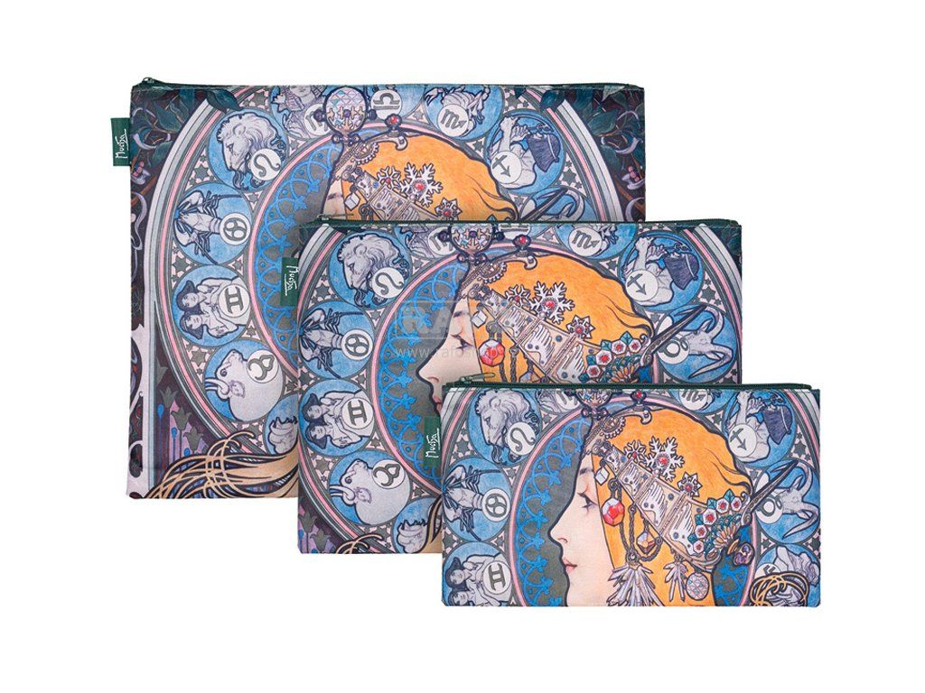 Kam uklidit kartáček, zubní pastu nebo rtěnku? Jak v kufru oddělit ponožky a spodní prádlo? Mít hned po ruce doklady a další potřebné dokumenty? Máme pro vás skvělé řešení! Díky těmto praktickým a stylovým taštičkám na zip ve třech velikostech máte vše pohodlně a rychle po ruce. Navíc jsou v trendy motivech. Taštičky jsou potištěná dekorem klasika českého malířství Alfonse Muchy. Rozměry: MINI – 23 x 13 cm, MIDI 27 x 20 cm, MAXI 31 x 25 cmDoplňkové parametry
