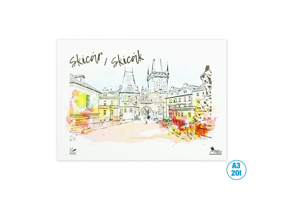Skicák z výkresového kartónu, lepený, podlepený šedou lepenkou. Formát: A3. Počet listů: 20. Gramáž: 180g.Doplňkové parametry
