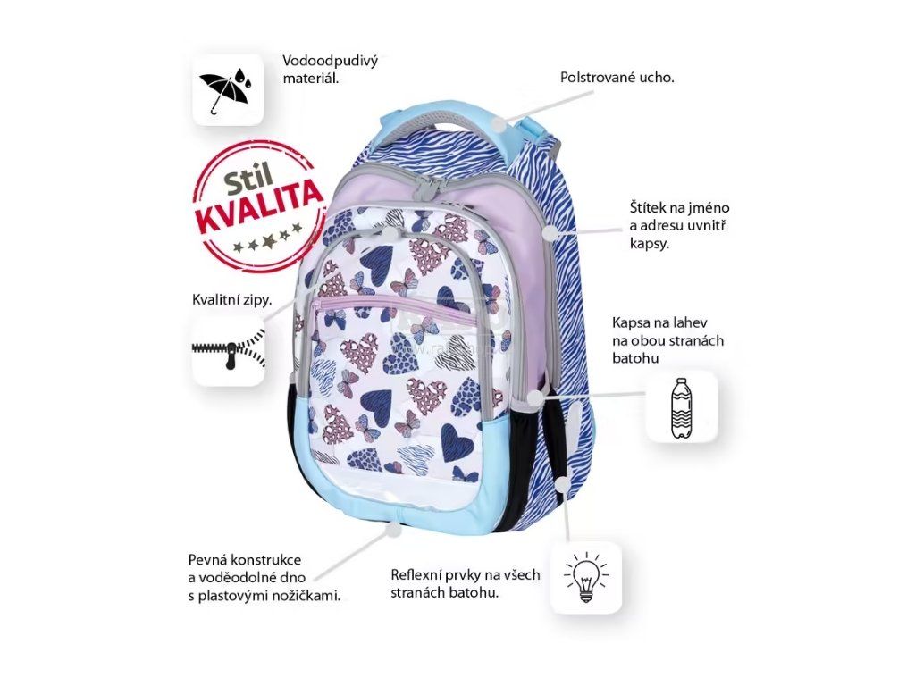 Školní batoh VHODNÝ PRO 1. – 4. třídu. Kvalitní, ergonomicky tvarovaný odlehčený školní batoh je vybaven reflexními prvky a anatomicky tvarovanými zády s pevnou konstrukcí. Školní batohy Stil jsou ověřeny odborníky. • Rozměr: výška 40 cm, šířka 30 cm, hloubka 20 cm • Hmotnost: 0,9 kg • Nosnost: 7 kg • Objem: 20 l • STIL ADJUSTABLE SYSTÉM – nastavitelný systém zad se třemii stupněmi pro optimální usazení batohu na zádech podle výšky a věku dítěte. Batoh, který roste s dítětem • 3D ZÁDOVÝ SYSTÉM – batoh perfektně sedí na zádech. Anatomický zádový panel se přizpůsobí páteři dítěte a systém Air Flow a prodyšné polstrování umožní cirkulaci vzduchu a příjemné nošení. Hrudní pás s kvalitní přezkou zajistí dobré usazení aktovky na zádech dítěte • BEZPEČNOST - bezpečnostní prvky jsou velmi důležité, proto je aktovka vybavena reflexní pásky na všech stranách batohu, které zaručí lepší viditelnost a bezpečnost dítěte ve tmě • VNITŘNÍ USPOŘÁDÁNÍ - Skládá se ze 3 prostorných komor opatřených pevnými zipy a přední kapsy pro uložení drobných předmětů • Pevná kontrukce a voděodolné dno s plastovými nožičkami • AIR FLOW – prodyšné pohodlně tvarované polstrování zadního panelu • Anatomicky tvarované nastavitelné popruhy pro pohodlné nošení • Hrudní pás pro lepší rozložení váhy školního batohu na zádechDoplňkové parametry