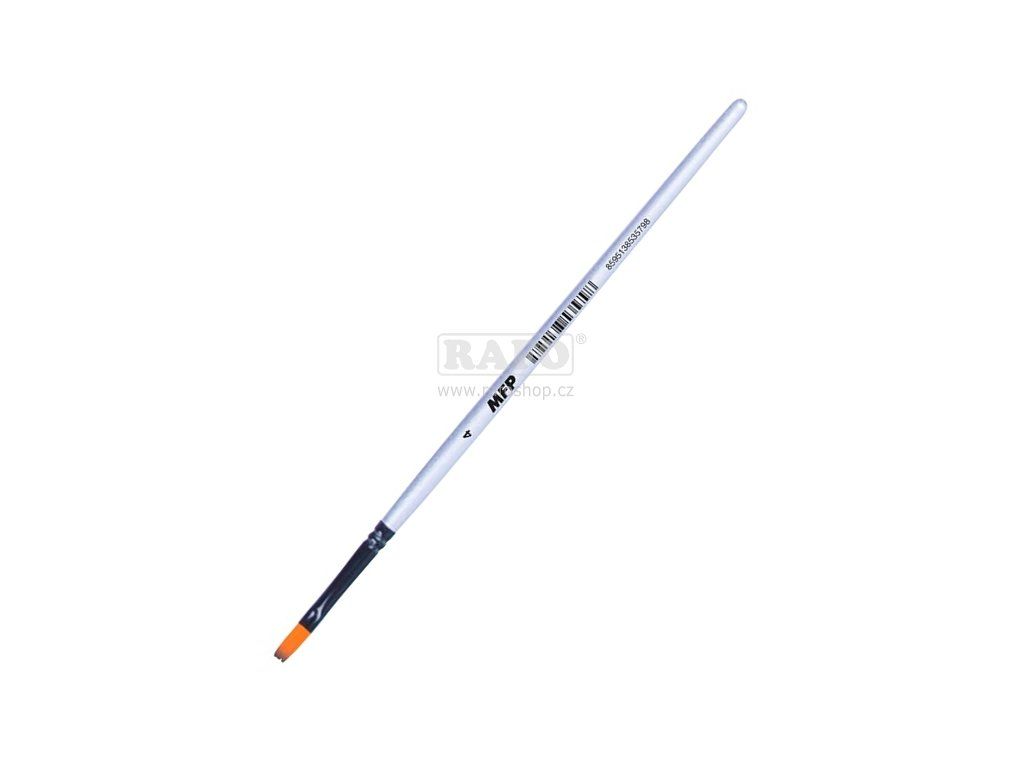 Štětec plochý syntetický s jemným vlasem tvarovaným do špičky a dřevěnou rukojetí. Díky syntetickým vláknům usnadňuje roztírání barev a dobře drží tvar. Vlákno je elastické a vyniká vysokými absorpčními schopnostmi. Je méně náchylný k poškození barvami a ředidly než štětec přírodní. Je také výrazně odolnjěší proti poškození či lámaní. Snadno se udržuje v čistotě, a proto vykazuje delší životnost. Hodí se jak pro školní využití, tak i pro různé malířské techniky a povrchy. Ideální pro malování detailů, tenkých linek nebo vybarvování.Doplňkové parametry