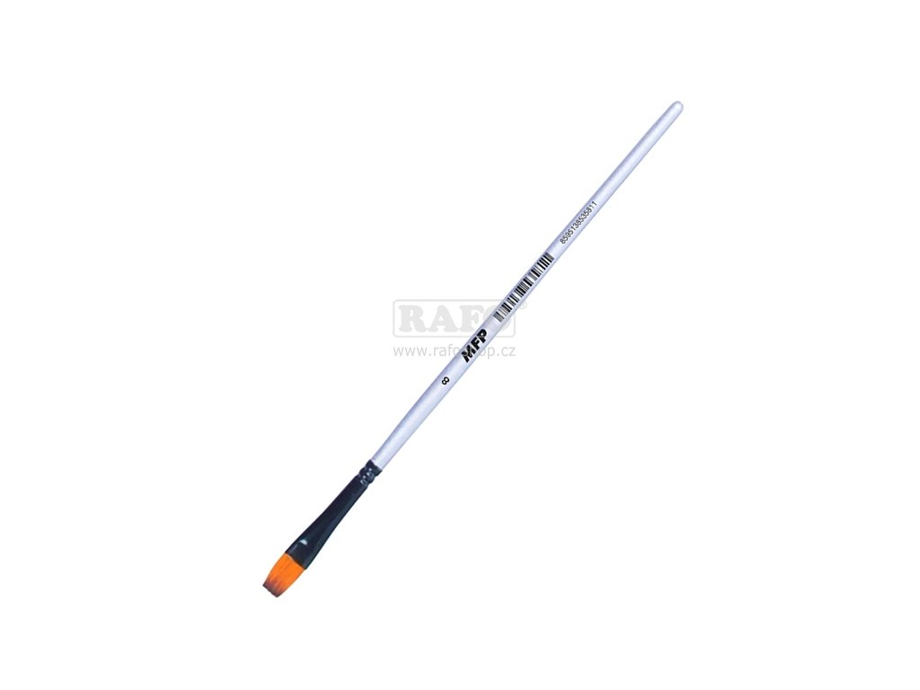 Štětec plochý syntetický s jemným vlasem tvarovaným do špičky a dřevěnou rukojetí. Díky syntetickým vláknům usnadňuje roztírání barev a dobře drží tvar. Vlákno je elastické a vyniká vysokými absorpčními schopnostmi. Je méně náchylný k poškození barvami a ředidly než štětec přírodní. Je také výrazně odolnjěší proti poškození či lámaní. Snadno se udržuje v čistotě, a proto vykazuje delší životnost. Hodí se jak pro školní využití, tak i pro různé malířské techniky a povrchy. Ideální pro malování detailů, tenkých linek nebo vybarvování.Doplňkové parametry