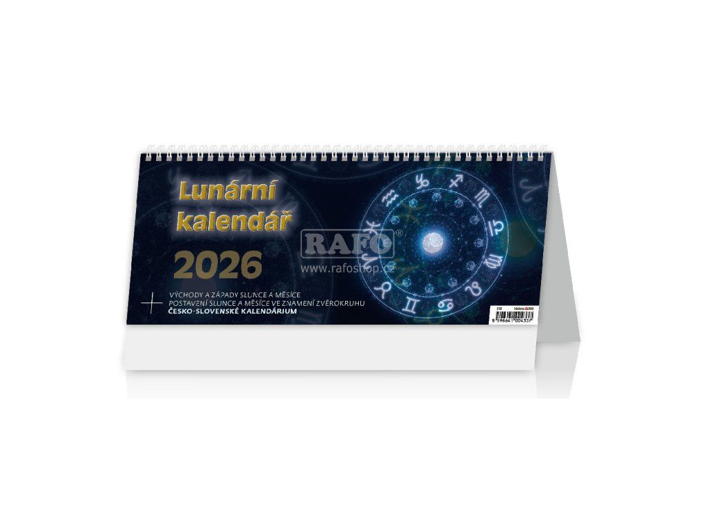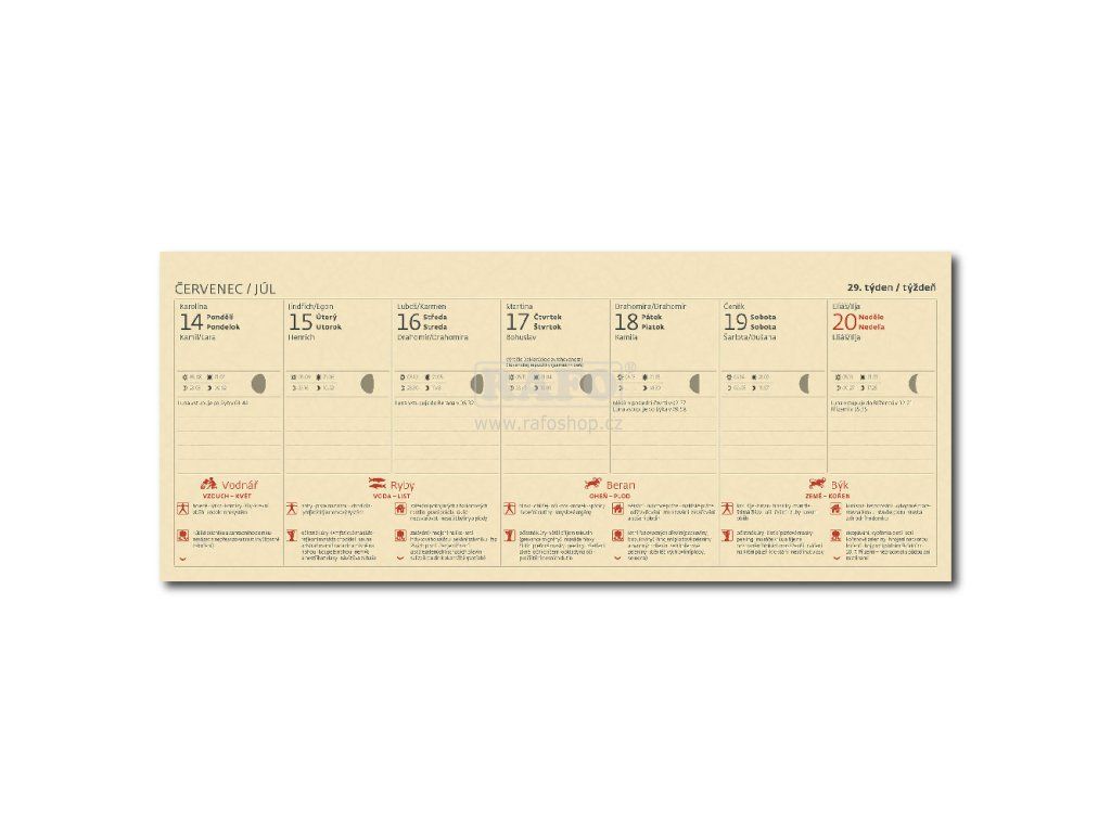 • Rozměr: 32,1 x 13,4 cm • Kalendárium: české/slovenské týdenní sloupcové jmenné • Rozsah kalendáře: 60 + 2 stran • Stojánek: zámkový • Vazba: Twin Wire • Plocha pro potisk: 32,1 x 3,5 cm • Obsahuje: východy a západy slunce a měsíce, postavení slunce a měsíce ve znamení zvěrokruhu, praktické rady.Doplňkové parametry