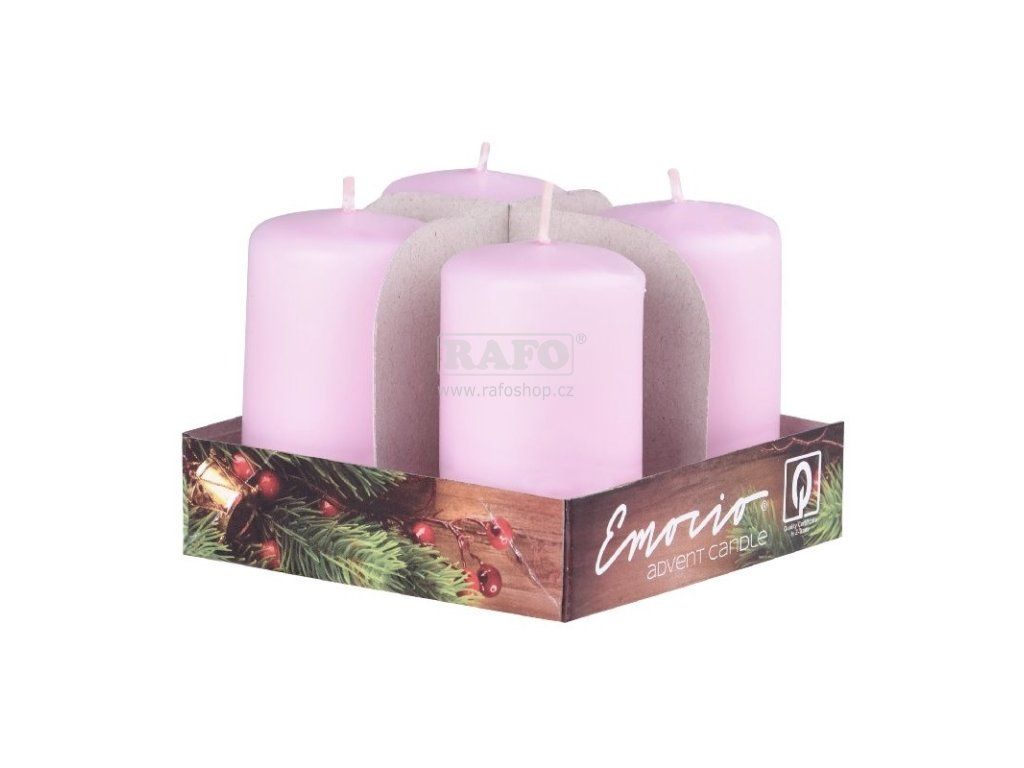 Adventní svíčky. Výška 7,5 cm, průměr 4 cm. V balení 4 ks. Svíčky mají špičaté zakončení - OBRÁZEK ILUSTRAČNÍ.Doplňkové parametry