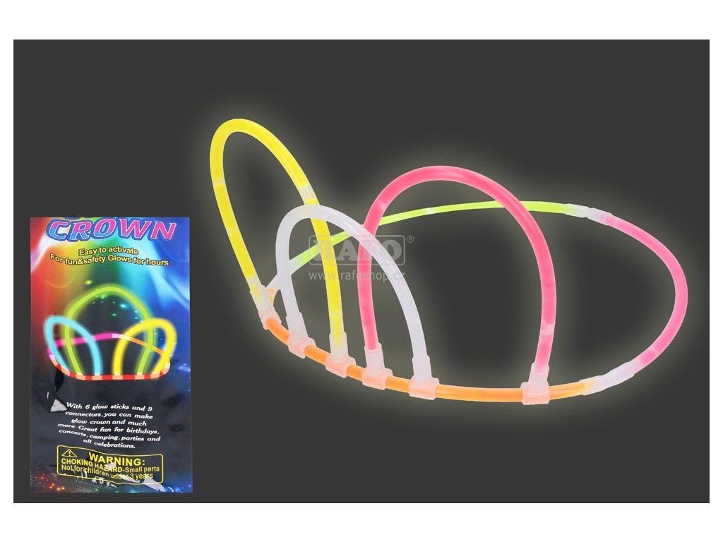 Svítící korunka. Obsahuje svítící tyčinky a spojky. NÁVOD NA POUŽITÍ: Tyčinku ohněte, spojte a protřepejte. Tyčinku nepropichujte, nelámejte ani nijak nedeformujte. Nedávejte do úst, nekousejte, tekutinu nepijte! Tekutina je netoxická, zdraví neškodná, ale při vniknutí do očí může dráždit. V takovém případě důkladně propláchněte čistou vodou. VAROVÁNÍ: Nevhodné pro děti do 3 let, nebezpečí spolknutí malých částí. Doporučený věk je od 5 let. Při používání dětmi je nutný trvalý dozor dospělé osoby.Doplňkové parametry