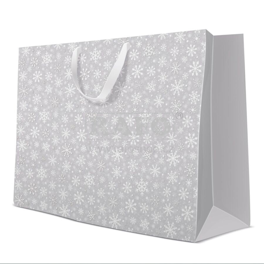 Taška dárková vánoční Stříbrná s vločkami, 44 x 54 x 16 cm