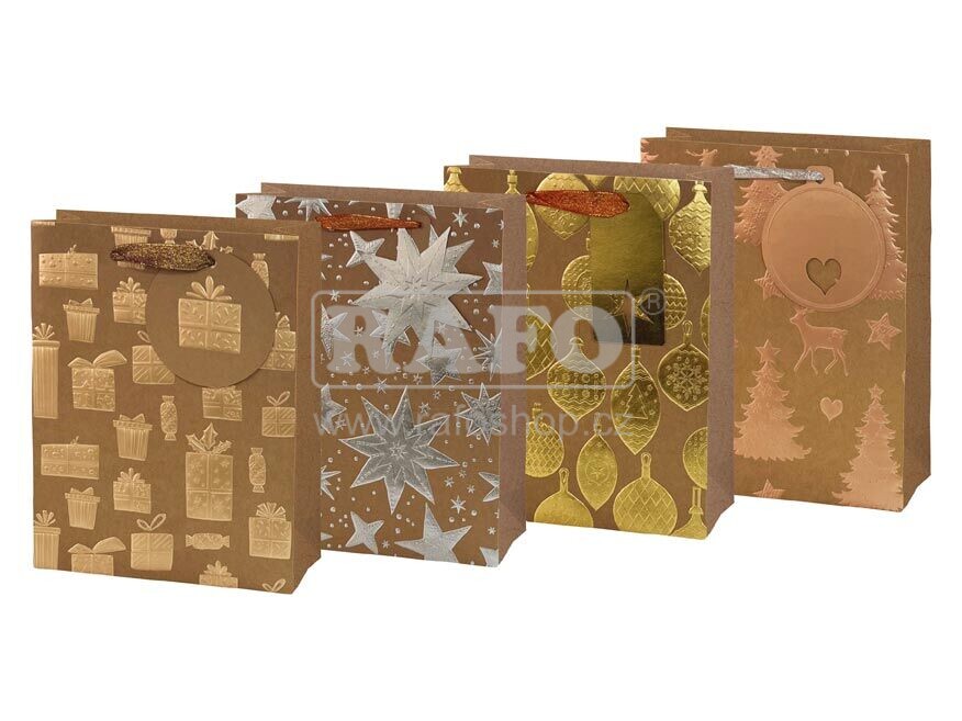 Vánoční papírová dárková taška L LUX KRAF s vánočními motivy je skvělou volbou pro každého, kdo hledá stylový a praktický způsob balení dárků. Je vyrobena z pevného kraftového papíru, který zaručuje nejen vysokou odolnost, ale také atraktivní vzhled. Taška je vybavena textilními uchy pro pohodlné přenášení a obsahuje kartičku, na kterou můžete napsat jméno obdarovaného nebo krátké přání. Rozměr: 260 x 320 x 120 mm. Dodáváme v mixu po 4 ks dle skladové zásoby.