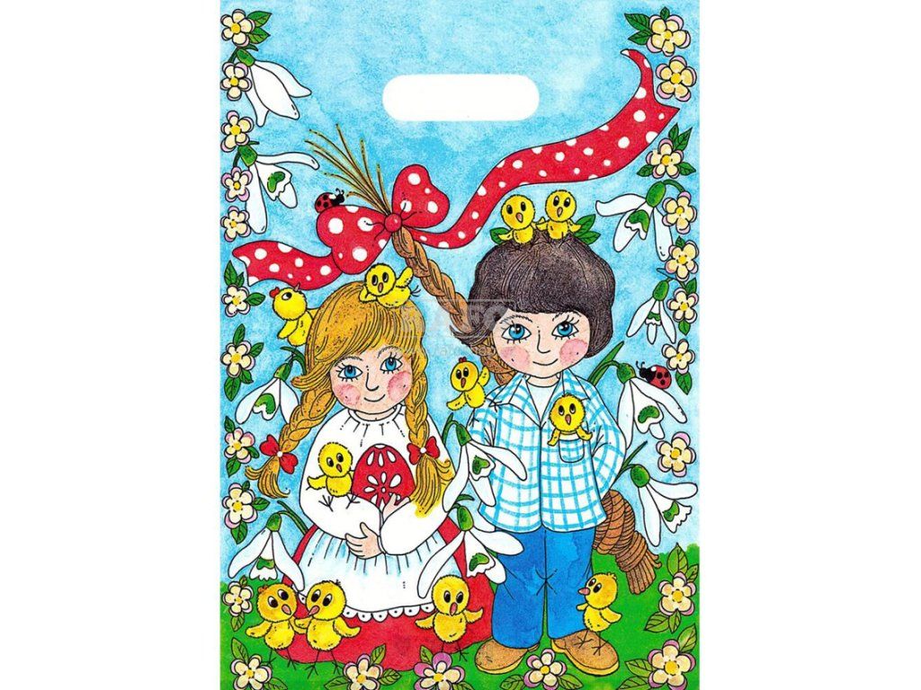 Igelitová taška s velkonočním motivem. Provedení proseklé zpevněné ucho včetně složeného dna. Fólie je určená pro přímý styk s potravinami a je zdravotně nezávadná. Rozměry: 25 x 35 cmDoplňkové parametry