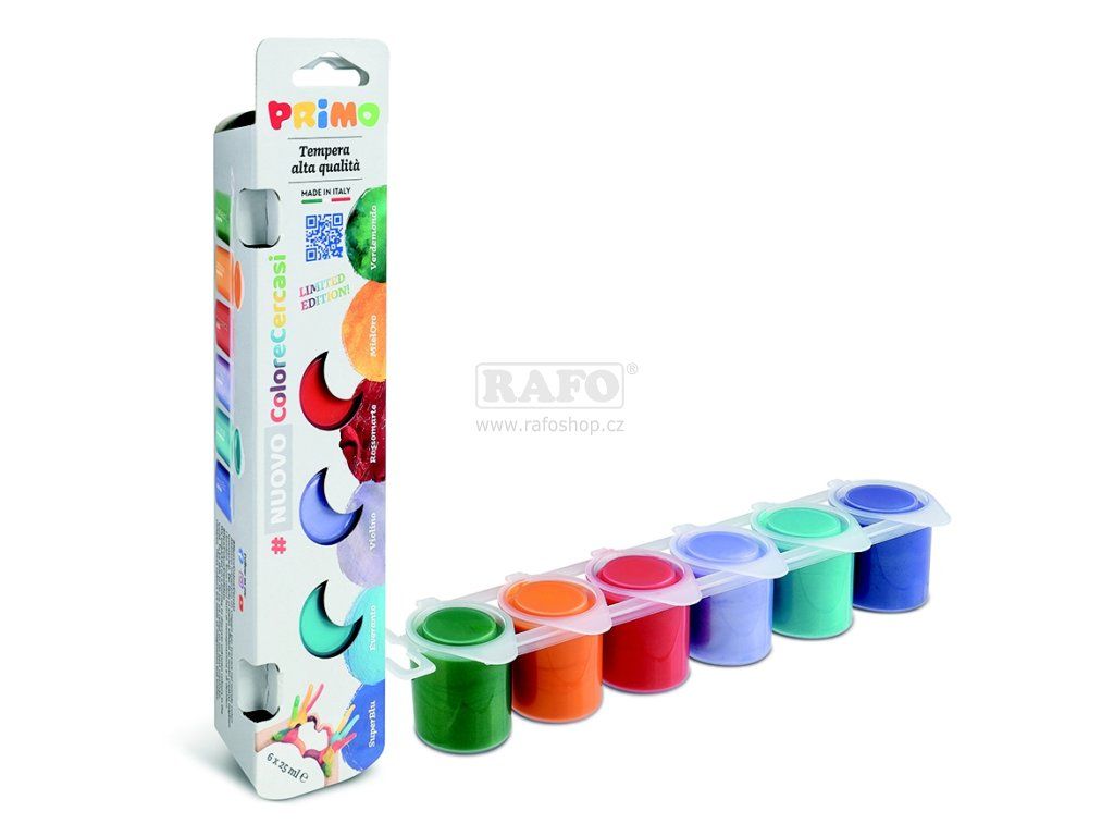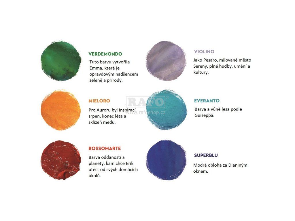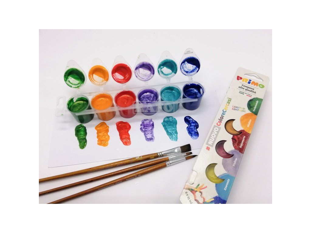 “SuperBlu, Everanto, Violino, Rossomarte, MielOro a Verdemondo je šest speciálně vytvořených odstínů, které byli vybrány díky soutěži #NewColourCandidate a které daly život speciální edici temper Primo. Tyto barvy jsou vyrobeny z fantazie a přání dětí (barvy navrhli: Emma, Aurora, Erik, Serena, Giuseppe, Diana).” Perleťové temperové barvy PRIMO s jasnými pigmenty: 6 x 25 ml • praktické, plastové, uzavíratelné, znovupoužitelné kelímky • dobré krycí barvy • brilantní odstíny • vodou ředitelné • nejsou voděodolné • vypratelné • vhodné na všechny technikyDoplňkové parametry