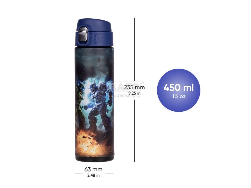 Praktická termoláhev BAAGL s akčním motivem robotů, intuitivním otevíráním a silikonovým pítkem. • Praktická termoláhev s intuitivním otevíráním a integrovaným silikonovým pítkem je díky snadné obsluze ideální volbou pro děti na prvním stupni ZŠ i předškoláky. • Láhev s objemem 450 ml nabízíme v několika hravých designech, které lze sladit s další školní výbavou. • Díky dvoustěnné konstrukci z nerezové oceli a objemu 450 ml udrží láhev horký nápoj až 12 hodin, zatímco studené nápoje zůstanou osvěžující až 24 hodin. • Termoláhev není vhodná do mrazáku, myčky na nádobí ani mikrovlnné trouby. • Produkty BAAGL podléhají testům kvality Institutu pro testování a certifikaci (ITC) a nezávislých laboratoří, jako je QIMA.Doplňkové parametry