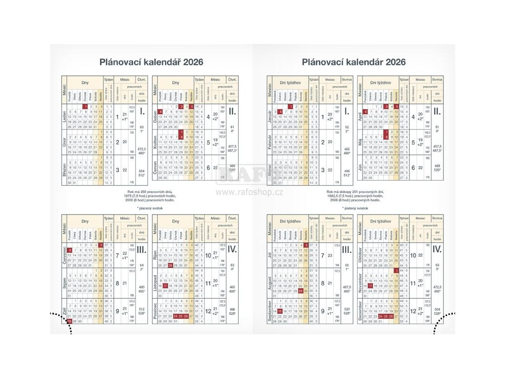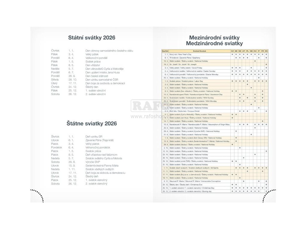 • Rozměr: 145 x 205 mm • Formát: A5 • Kalendárium: týdenní české/slovenské • Počet stran: 144 • Barva bloku: bílá • Vazba: V8 • Potahový materiál: matné lamino s parciálním lakemDoplňkové parametry