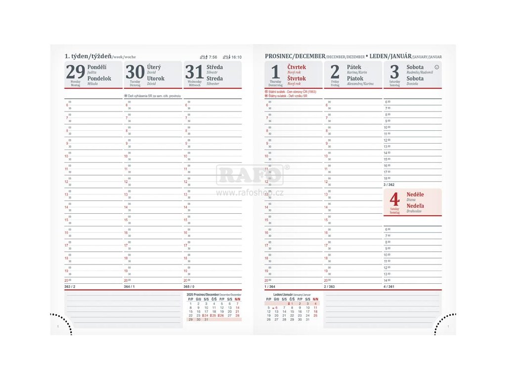 • Rozměr: 145 x 205 mm • Formát: A5 • Kalendárium: týdenní české/slovenské • Počet stran: 144 • Barva bloku: bílá • Vazba: V8 • Potahový materiál: PU povrch připomínající přírodní korekDoplňkové parametry