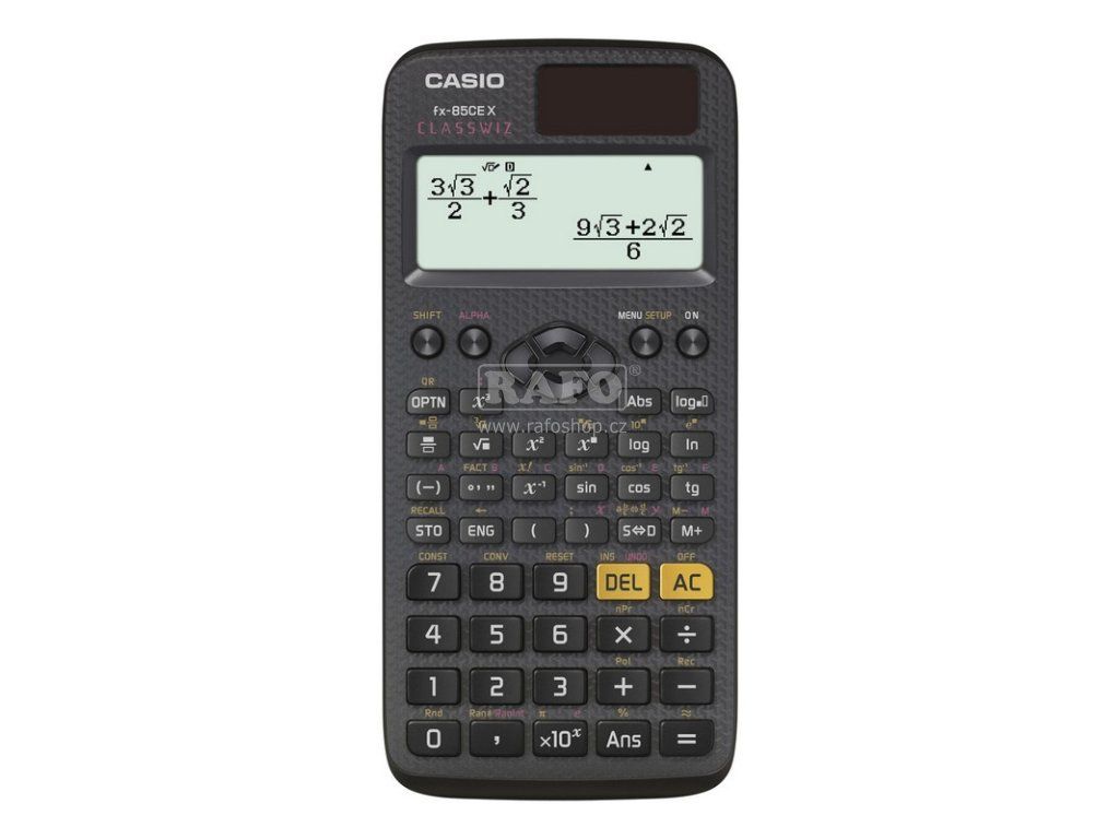 Model Casio FX 85 CE X představuje školní kalkulačku s pevným krytem, displejem s velkým rozlišením 192 × 63 pixelů a novou funkci QR-Code. Navíc nová serie ClassWiz disponuje rychlejším procesorem a dvojnásobnou pamětí. CASIO ClassWiz nabízí oproti minulým modelům nové funkce a poprvé je k dispozici v češtině, maďarštině, polštině a slovenštině. Celkem má 379 funkcí, ikonové menu, 47 vědeckých konstant, 38 metrických převodů, vícenásobnou odpověď, 9 pamětí proměnných a mnohé další funkce. Kalkulačka Casio FX 85 CE X využívá solární + bateriové napájení (1×LR44), její rozměry činí 77×166×11 mm a hmotnost 90 gramů. Technické parametry: Míst na displeji: 10. Rozlišení displeje: 63×192. Slot na baterie: LR44. Míst na displeji: 10. Rozměry [š x v x h mm]: 77×165,5×11,1. Rozlišení displeje: 63×192. Barva: Černá. Hmotnost samotné kalkulačky: 90g.Doplňkové parametry