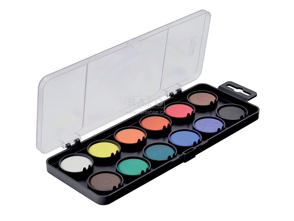 Klasické vodové barvy v soupravách po 12 odstínech. Mají jasné a syté barvy. Velikost tablet je větší, 30 mm v průměru. Barevník je obdélníkového tvaru z plastu.Doplňkové parametry