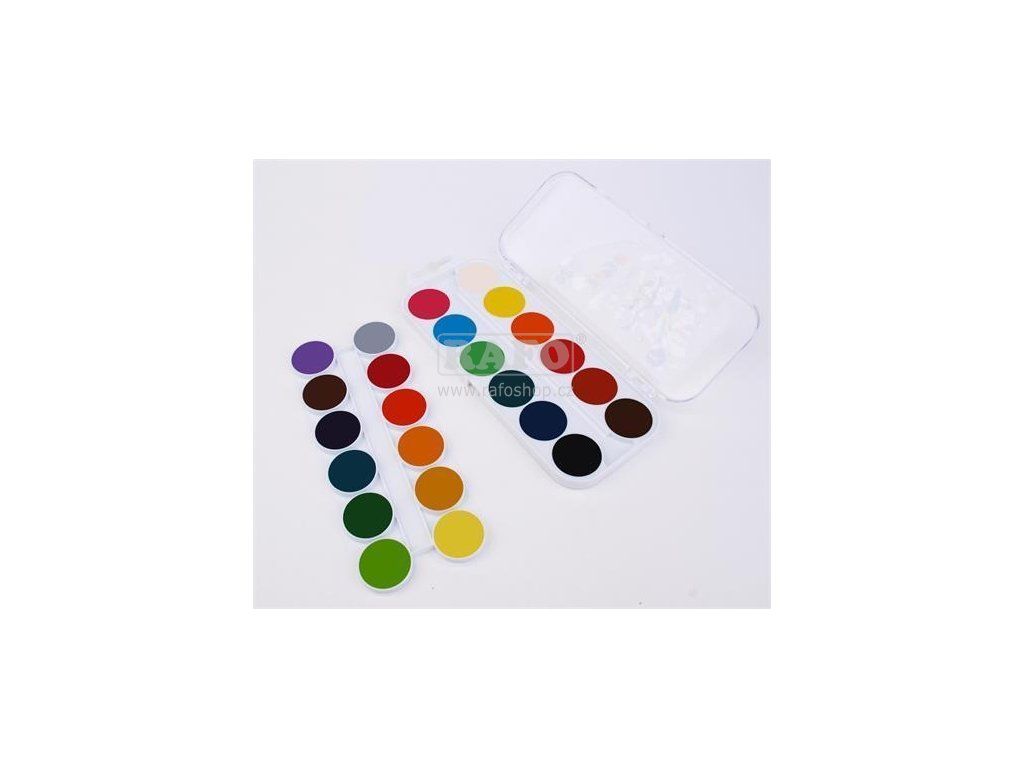 Vynikající intenzita barev. Dobře roztíratelné barvy vyrobené z přírodních barviv. Rovnoměrné krycí vlastnosti. Jasné a zářivé vodové barvy. Průměr barevných kruhů: 24 mm. Malý, kompaktní plastový box, do víčka se dá vložit patro vodovek a vytvoří stabilní paletu barev. Doporučené pro děti od 3 let.Doplňkové parametry