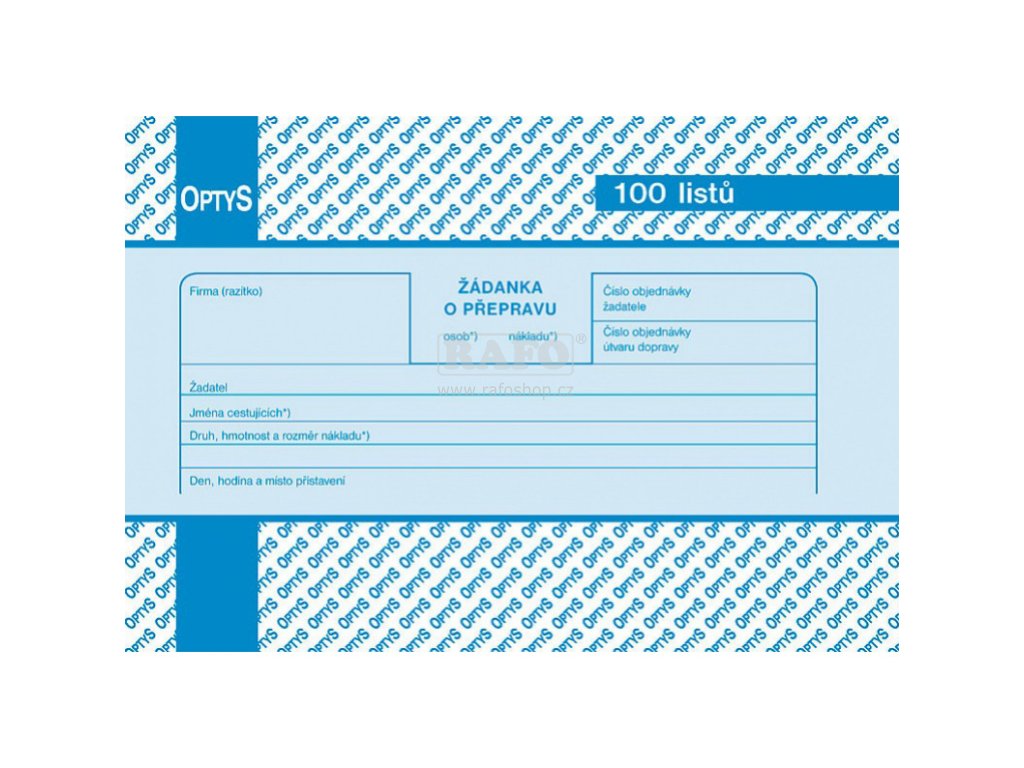 Žádanka o přepravu A6, Optys 1176. Nepropisující tiskopis. Blok 100 listů. Formát A6. Modrá obálka. Nečíslovaný.Doplňkové parametry