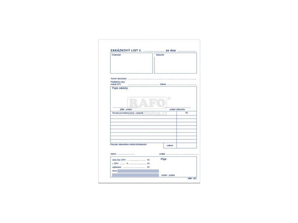 Zakázkový list A5 propisující mSk 351. Samopropisovací blok, 100 listů.Doplňkové parametry
